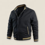 Effortlessly cool and tailored, this 100% breathable material bomber jacket is the perfect blend of comfort and sophistication. Featuring ribbed striped accents and a sleek silhouette, it’s your go-to choice for smart casual layering.